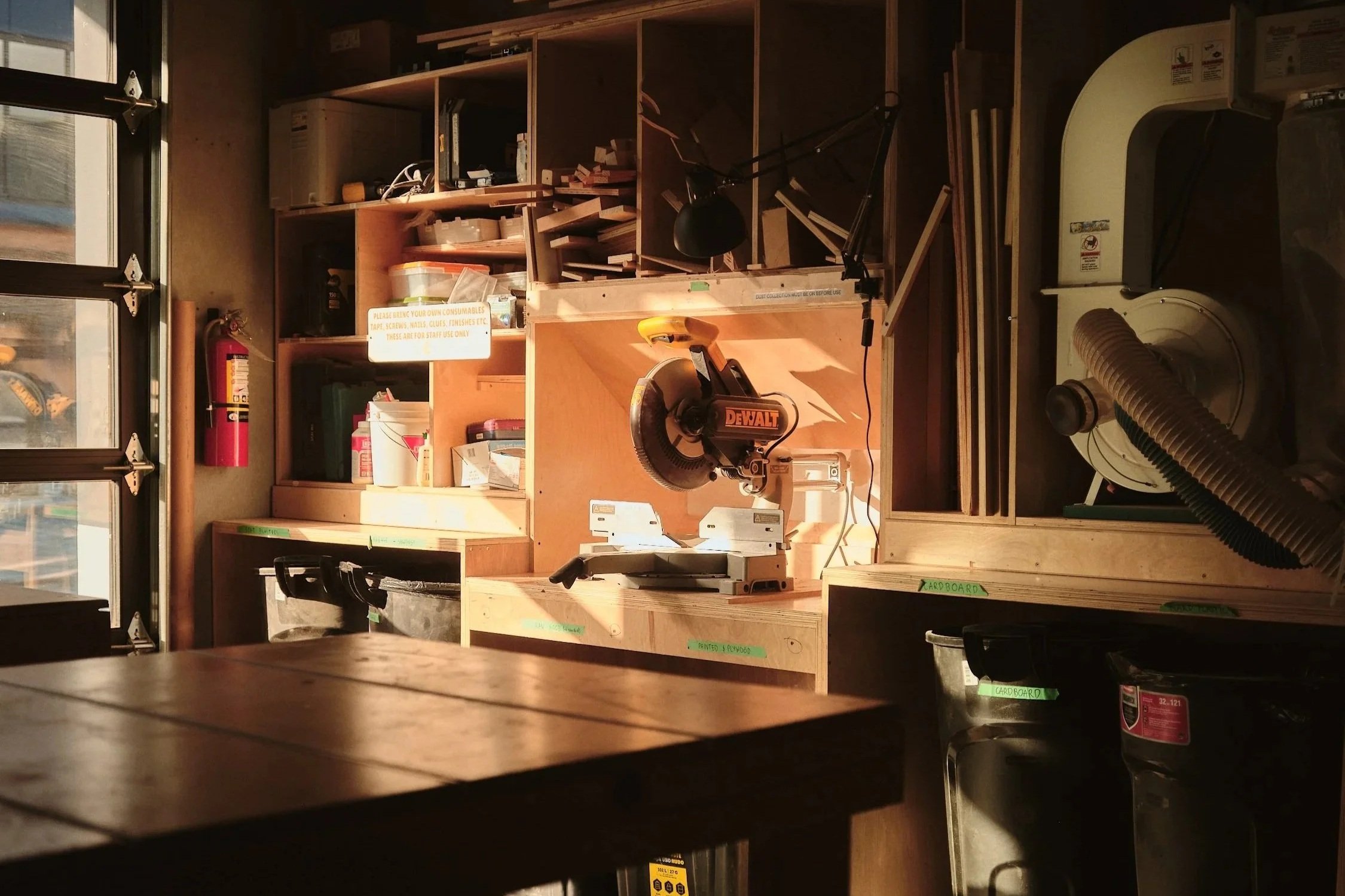 You’ll use a full range of hand and power tools in our woodshop, including saws (table, mitre, band), drills, planers, and sanders. Materials include plywood and hardwoods for your projects.